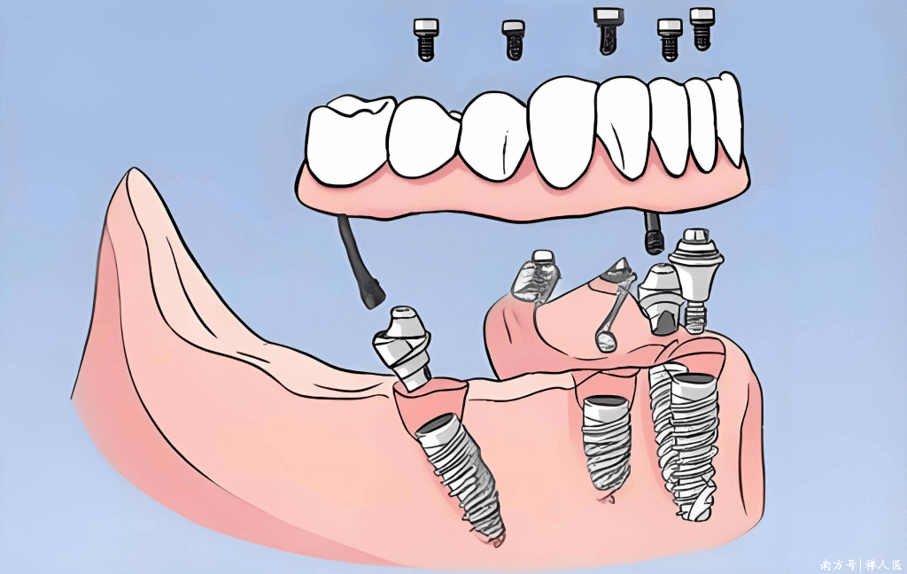 半口缺牙:常仅需4-6颗种植体即可支撑整排假牙。