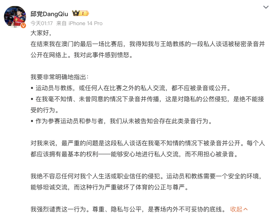 大家好灵菲配资,在结束我在澳门的最后一场比赛后,我得知我与王皓教练的一段私人谈话被秘密录音并公开在网络上。我对此事件感到愤怒。